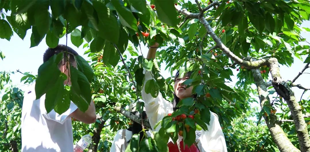 初夏时节,虽然烈日当空,但青年员工的热情与活力丝毫不减。樱桃园内,翠绿的枝条间,一颗颗晶莹剔透的红樱桃点缀其中,好不漂亮。青年员工们三三两两的分布在园内,相互交谈着工作和生活中的经历,谈笑间充满着对未来生活的美好向往。